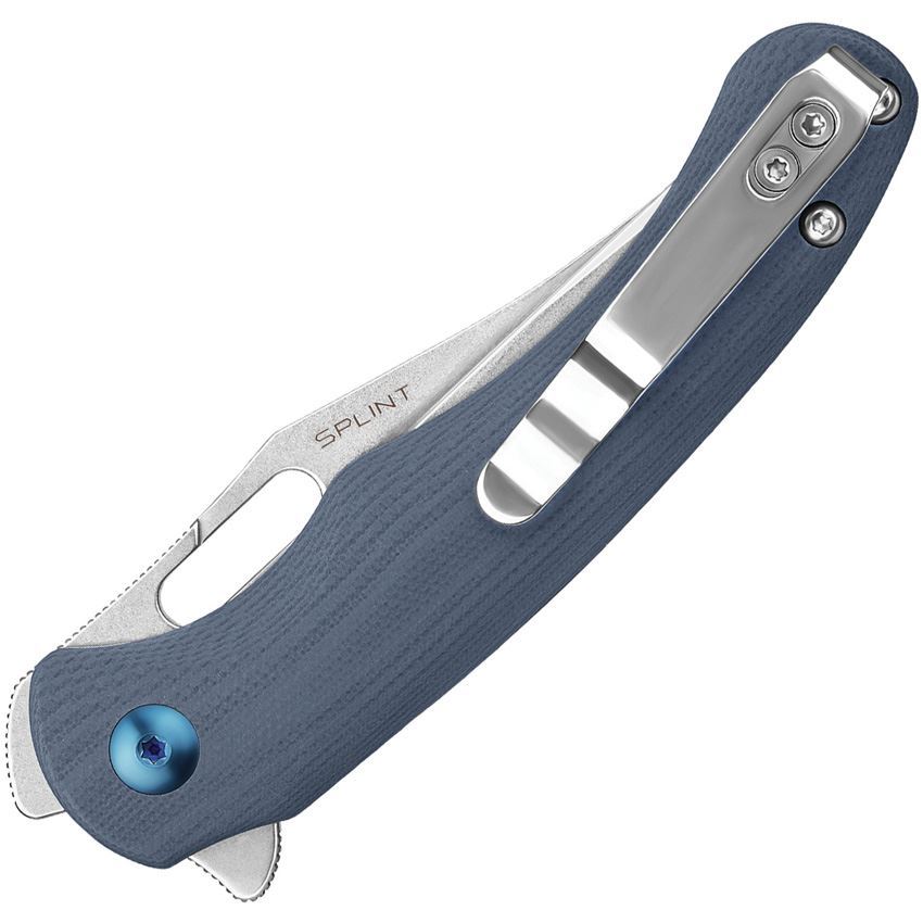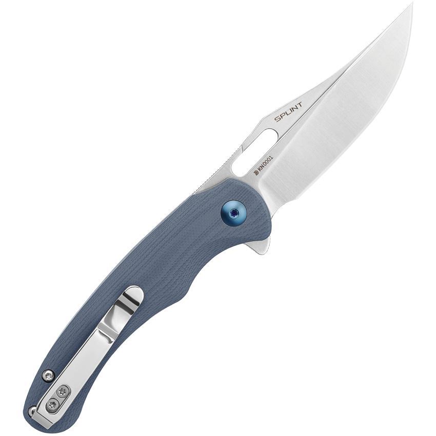 Model/Item/Part - OLTSPLINTGY. Olight - Splint Linerlock Knife with Blue-Gray Handles. 4" (10.16cm) closed. 3" (7.62cm) satin finish Bohler N690 stainless clip point blade. Blue-Gray G10 handle. Thumb pull. Extended tang. Pocket clip. Boxed. Made in China.