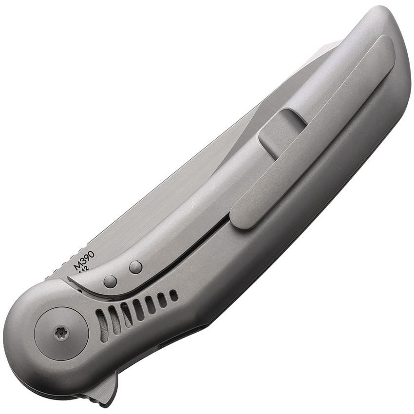 Model/Item/Part - REAGENTS9LB. Reate Knives - Gent 9 Framelock Knife Light Titanium Handles. 4.5" (11.43cm) closed. 3.25" (8.26cm) satin finish Bohler M390 stainless blade. Tumbled finish titanium handle. Extended tang. Pocket clip. Black nylon pouch. Boxed. Made in China.