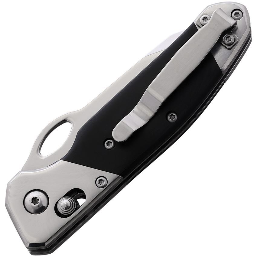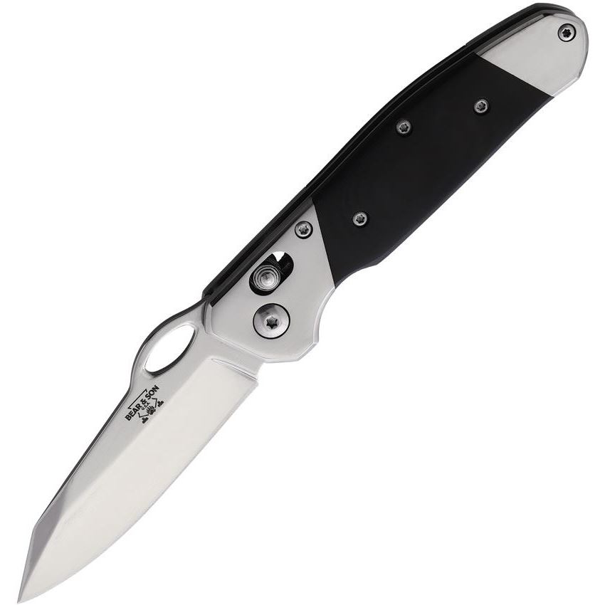 Model/Item/Part - BCG10N. Bear & Son Cutlery - Slide Lock Black G10. 4.25" (10.8cm) closed. 3.38" (8.59cm) satin finish D2 tool steel blade. Black G10 handle. Stainless bolster(s). Thumb pull. Pocket clip. Boxed. Made in USA.