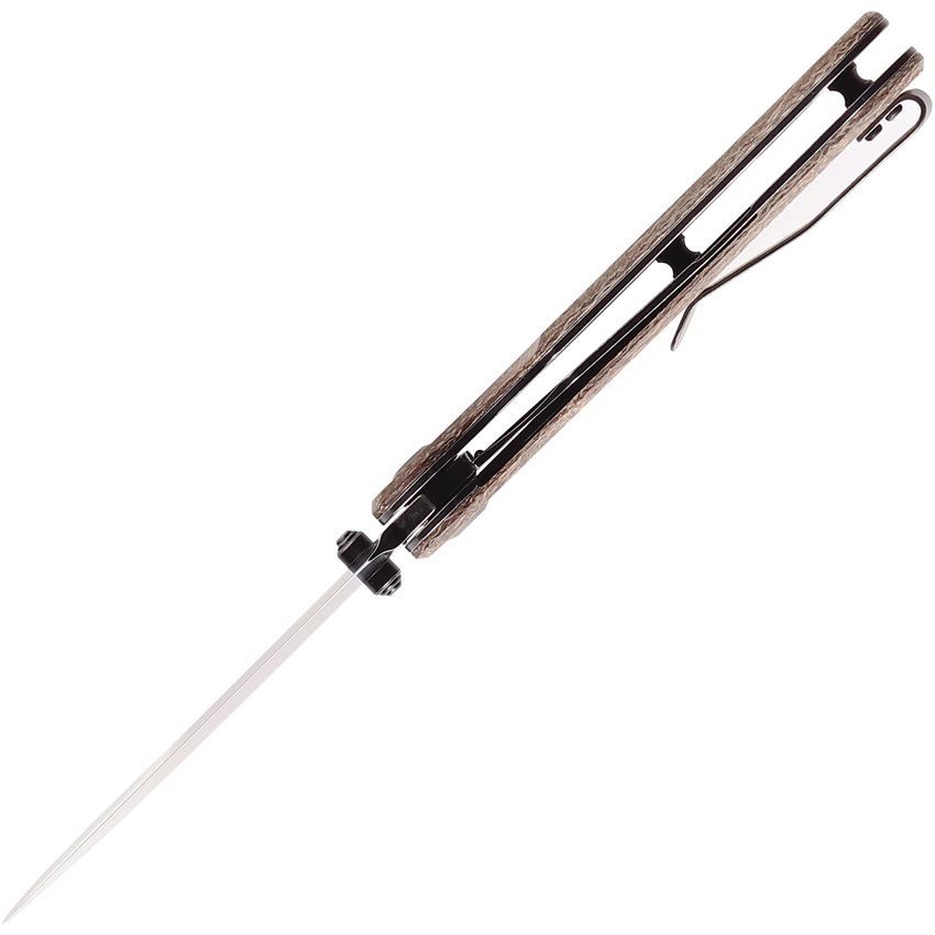 Model/Item/Part - K1039A4. Kansept Knives - Nesstreet Linerlock Brown. 4.5" (11.43cm) closed. 3.5" (8.89cm) black stonewash finish CPM S35VN stainless blade. Brown canvas micarta handle. Thumb stud. Pocket clip. Black nylon pouch. Boxed. Made in China.