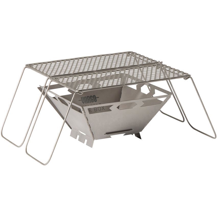Model/Part Number - VR320. Vargo Outdoor Camping Gear Fire Box Grill 2.0. Pack size: 6" x 8.5". Weight: 7.5oz. Grate size: 7.5" x 8". 4.25" open height. Fold flat design fits in any pack. Burns Biomass fuel (not included). Hinged grate for easy setup. Drawstring nylon carry case. Bulk packed. Made in China.
