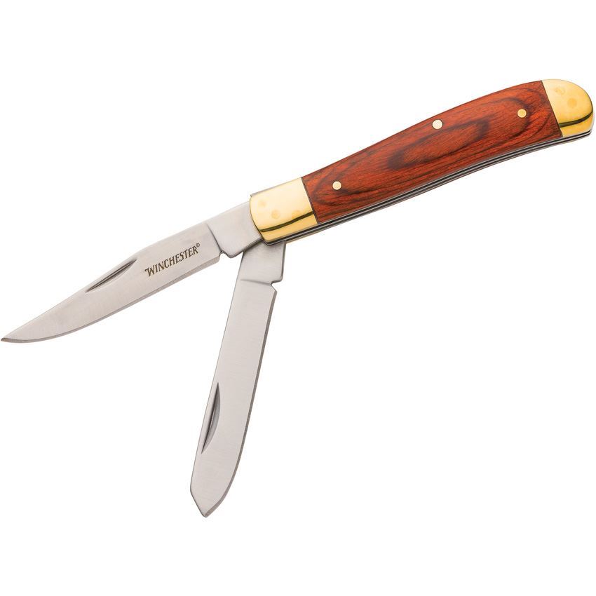 Model/Part Number - WN6220090W. Winchester Knives Trapper with Gift Tin. 3.5" (8.89cm) closed. Satin finish stainless clip and spey blades. Brown wood handle. Nickel silver bolster(s). Winchester gift tin. Clam packed. Made in China.
