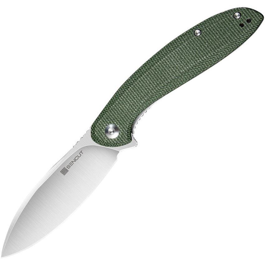 Model/Item/Part - S210033. SenCut Knives - San Angelo Linerlock Micarta. 4.5" (11.43cm) closed. 3.5" (8.89cm) satin finish 9Cr18MoV stainless blade. Green canvas micarta handle. Extended tang. Pocket clip. Black nylon zippered storage case. Boxed. Made in China.