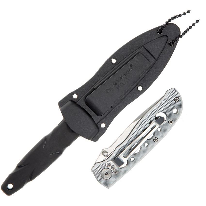 Model/Item/Part - SWP1105619. Smith & Wesson Knives - Extreme Ops/HRT Set. Includes: HRT Fixed Blade-7.25" overall with 3.25" blade oxide coated 7Cr17MoV stainless blade, black TPR handle, lanyard hole, and hard synthetic sheath. Extreme OPS linerlock-4.25" closed with 3.25" satin finish 7Cr17MoV stainless blade, blue-gray aluminum handle, thumb stud, lanyard hole, pocket clip. Clam packed. Made in China.