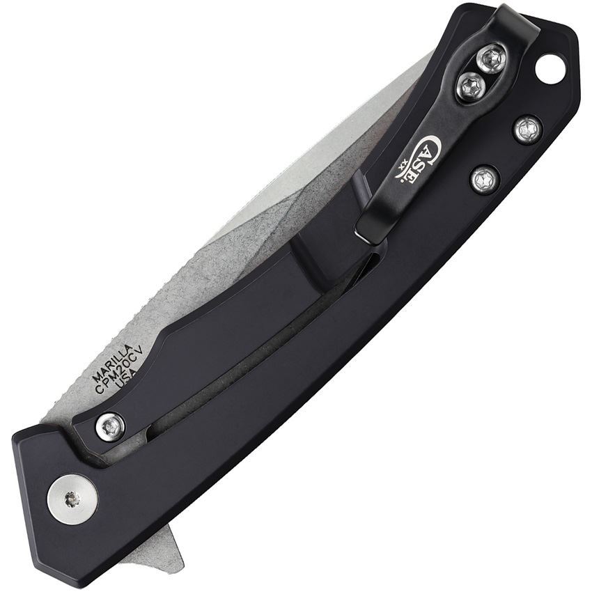 Model/Item/Part - CA25884. Case XX Knives - Marilla Linerlock Black. MARILLA CPM 20-CS pattern. 4.75" (12.07cm) closed. 3.75" (9.53cm) stonewash finish blade. Black anodized aluminum handle with black G10 inlay. Pocket clip. CPM-20CS stainless drop point blade. Boxed. Made in USA.