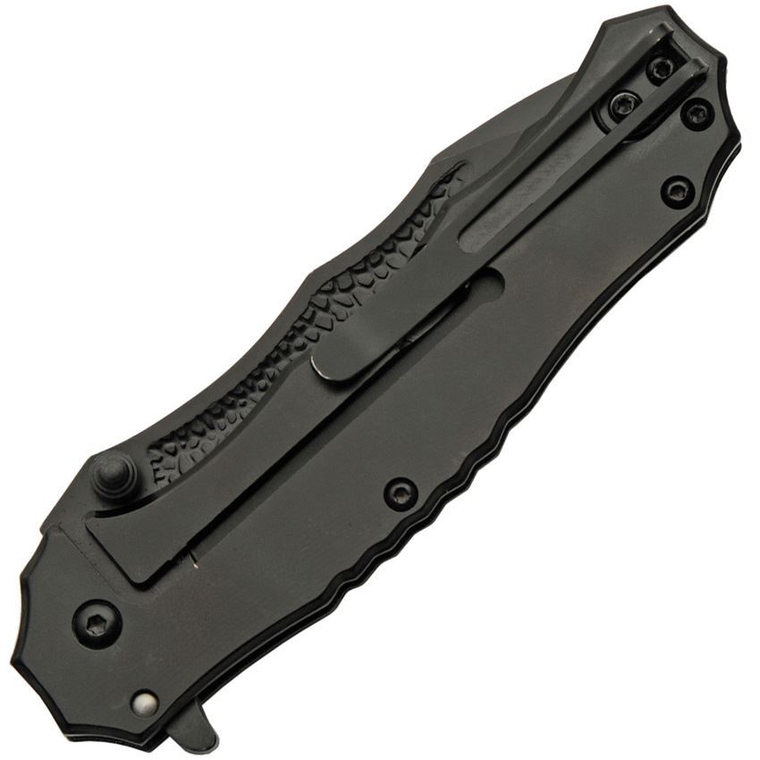 Model/Item/Part - CN300579. China Made - Dark Eye Framelock. 4.5" (11.43cm) closed. 3.5" (8.89cm) black finish stainless blade. Black aluminum handle. Extended tang. Thumb stud. Pocket clip. ABS coated handle with eye inlay. Boxed. Made in China.