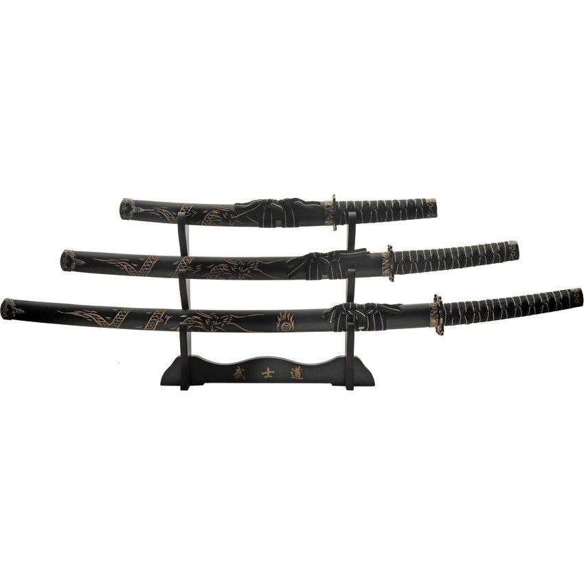 Model/Part Number - CN926970BK. China Made 3 Pc Black Dragon Katana. Stainless blade. Black cord wrapped nylon handle. Includes: 40" overall katana with 28" blade; 31.5" overall wakisashi with 20" blade; 21.5" overall tanto with 12" blade. Carved dragon on scabbards. Black wooden display stand. Boxed. Made in China.