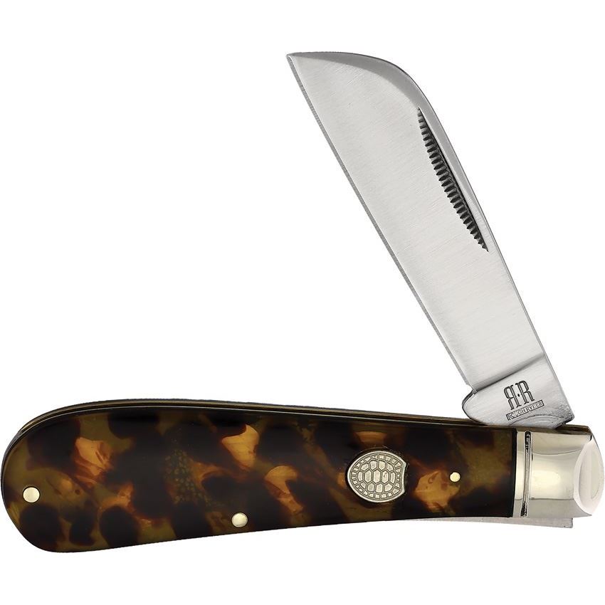 Model/Part Number - RR2454. Rough Rider Half Hawk Imitation Tortoise. Tortoise Shell. 3.88" (9.86cm) closed. Satin finish stainless hawkbill blade. Imitation tortoise shell handle. Nickel silver bolster(s). Inlay shield. Boxed. Made in China.