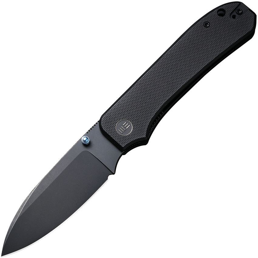 Model/Item/Part - WE210451. WE Knife Company - Big Banter Linerlock Black. 4.63" (11.76cm) closed. 3.63" (9.22cm) black stonewash finish CPM-20CV stainless drop point blade. Black G10 handle. Thumb stud. Lanyard hole. Pocket clip. Black nylon zippered storage case. Boxed. Made in China.