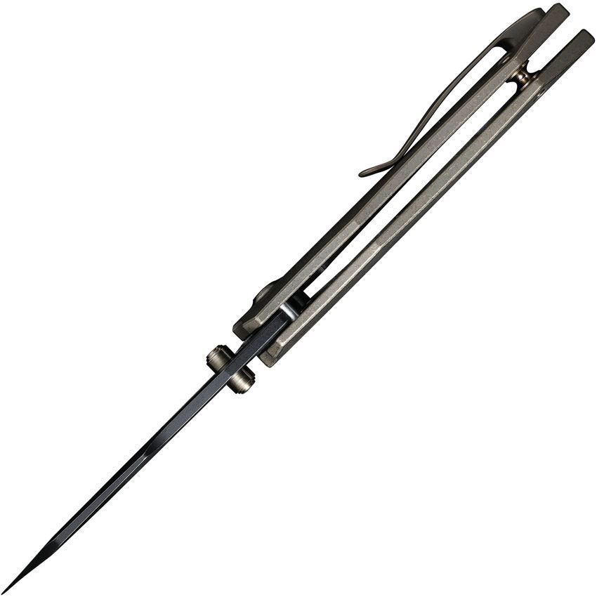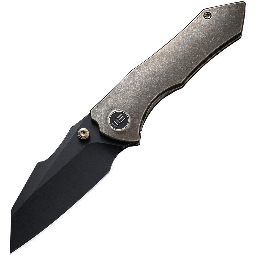 Model/Item/Part - WE220052. WE Knife Company - High-Fin Framelock Gray. 4" (10.16cm) closed. 3" (7.62cm) black stonewash finish CPM-20CV stainless blade. Bronze stonewash finish titanium handle. Thumb stud. Pocket clip. Black nylon zippered storage case. Boxed. Made in China.
