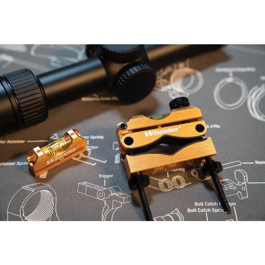 Model/Item/Part - WHE119050. Wheeler - Professional Reticle Leveling. Torque adjustments range from 10 inch pounds to 65 inch pounds. Accuracy +/- 2 inch pounds. 1/4" drive. Bits include: Leupold/Buehler windage, #10 flat, #11 flat, #32 flat, 3/32" Allen, 7/64" Allen, 5/32" Allen, T15, T20, and Square drive adapter bit. Includes plastic storage case. Clam packed. Made in China.