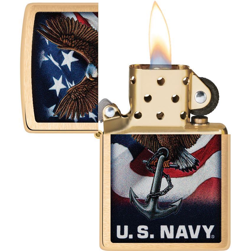 Model/Item/Part Number - ZO73748. Zippo U.S. Navy Lighter. Dimensions: 0.5" x 2.25". Brushed Brass. Boxed. Proudly made here in the USA.