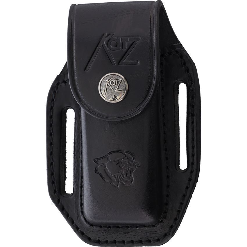 Model/Item/Part - KZK800DP. Katz Knives - Cheetah Small Lockback Knife Black Handles. 3.88" (9.86cm) closed. 2.88" (7.32cm) satin finish stainless drop point blade. Black Kraton handle. Stainless bolster(s). Thumb disk. Black leather belt sheath. Boxed. Made in Japan.