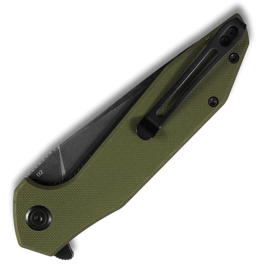 Model/Item/Part - KUB117E. Kubey Knives - Nova Linerlock OD. 4.88" (12.4cm) closed. 3.63" (9.22cm) black stonewash finish D2 tool steel blade. OD green G10 handle. Extended tang. Pocket clip. Boxed. Made in China.