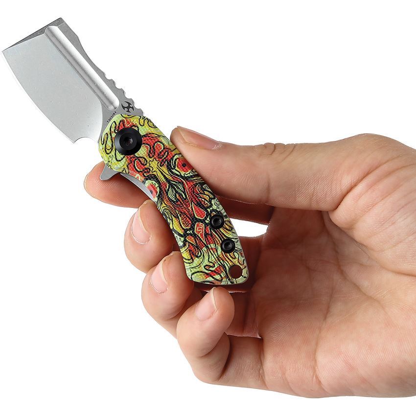 Model/Item/Part Number - KT3030B4. Kansept Mini Korvid G10 with Undead Pr. 2.25" (5.72cm) closed. 1.5" (3.81cm) stonewash finish 154CM stainless blade. Yellow Undead print artwork. Extended tang. Black nylon pouch. Boxed. Made in China.