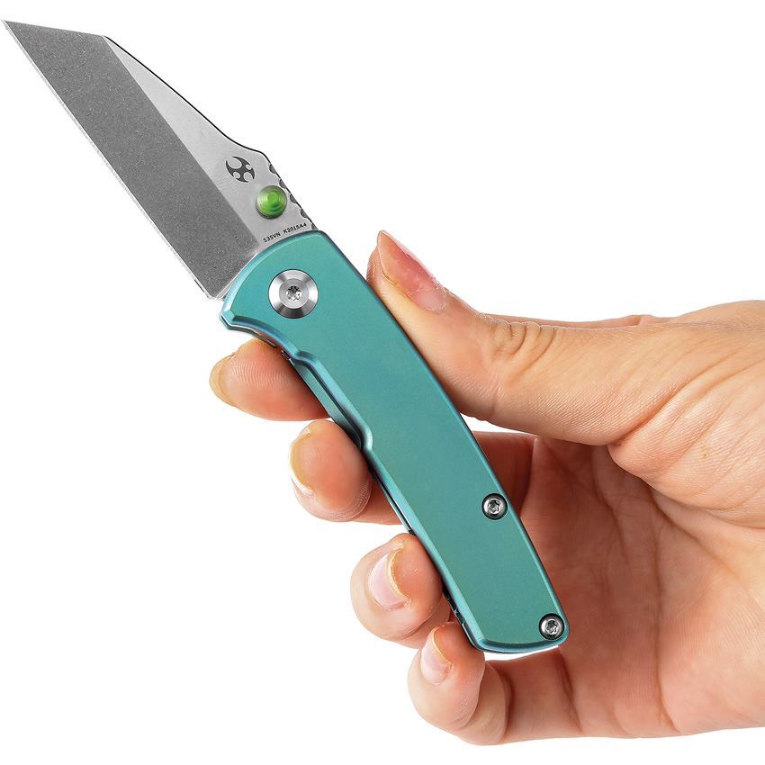 Model/Item/Part - K2015A4. Kansept Knives - Little Main Street. 3.13" (7.95cm) closed. 2.25" (5.72cm) stonewash finish CPM S35VN stainless blade. Teal titanium handle. Pocket clip. Thumb stud. Black nylon pouch. Boxed. Made in China.