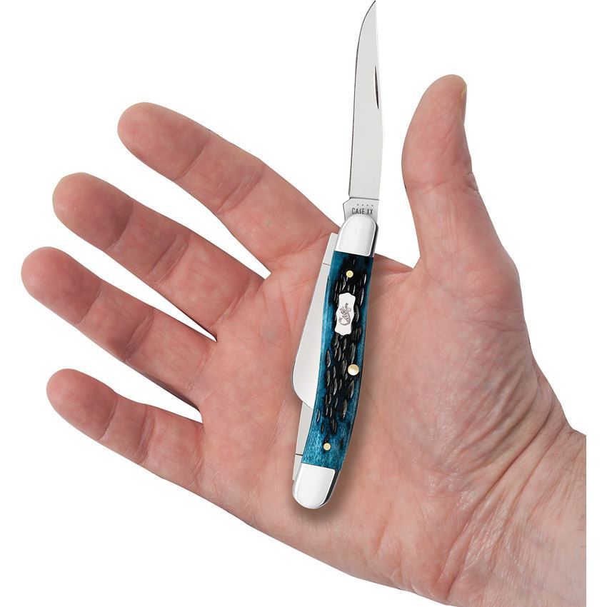 Model/Item/Part Number - CA51851. Case XX Stockman Mediterranean. 6318 SS pattern. 3.63" (9.22cm) closed. Mirror finish stainless clip, sheepsfoot, and spey blades. Pocket Worn Mediterranean Blue jigged bone handle. Nickel silver bolster(s). Inlay shield. Boxed. Proudly made in the USA.