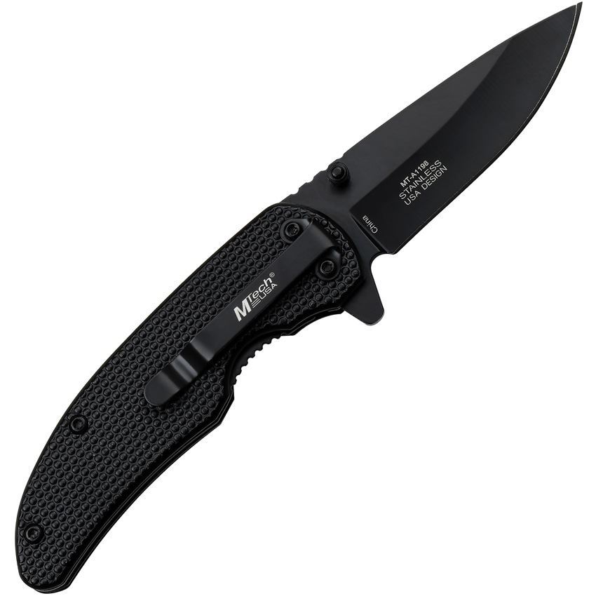 Model/Item/Part - MTA1198BK. MTech Knives - Assist Open Linerlock Knife with Black Handles. Assisted opening. 3.75" (9.53cm) closed. 2.75" (6.99cm) black oxide coated 3Cr13 stainless blade. Black aluminum handle. Extended tang. Thumb stud. Pocket clip. Boxed. Made in China.