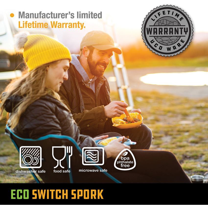 Model/Item/Part Number - UCO00417. UCO Eco Utility Spork Berry/Must. Dimensions: 7" x 1.3" x 0.75". Dishwasher safe. Three in one design delivers a fork, spoon, and serrated fork edge. Stackable, nesting design. Microwave safe. BPA and Phthalate free. Set of two (Berry and Mustard). Food grade recycled polypropylene construction. Hang packaged. Made in China.