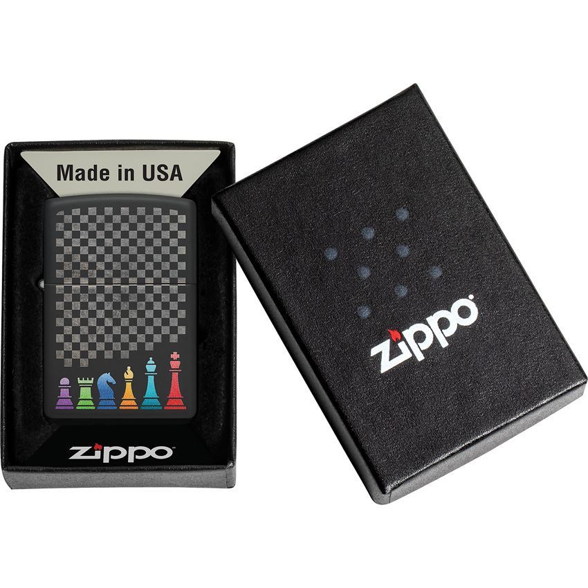Model/Item/Part Number - ZO74416. Zippo Chess Pieces Lighter. Dimensions: 2.25" x 1.5". Black Matte. Boxed. Proudly made in the USA.