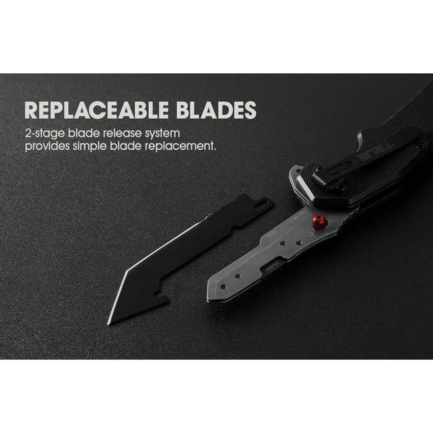 Model/Item/Part - TRUFMK1003. True Knives - Swift Edge Toggle Lock. 4.5" (11.43cm) closed. 3.5" (8.89cm) black oxide coated 5Cr13MoV stainless tanto blade. Black G10 handle. Lanyard hole. Pocket clip. Includes: (2) Drop point blades; (1) Titanium coated 65Mn steel saw blade. Two step replaceable blade system. Toggle lock. Ball bearing flipper. Blade case. Boxed with hanging tab. Made in China.