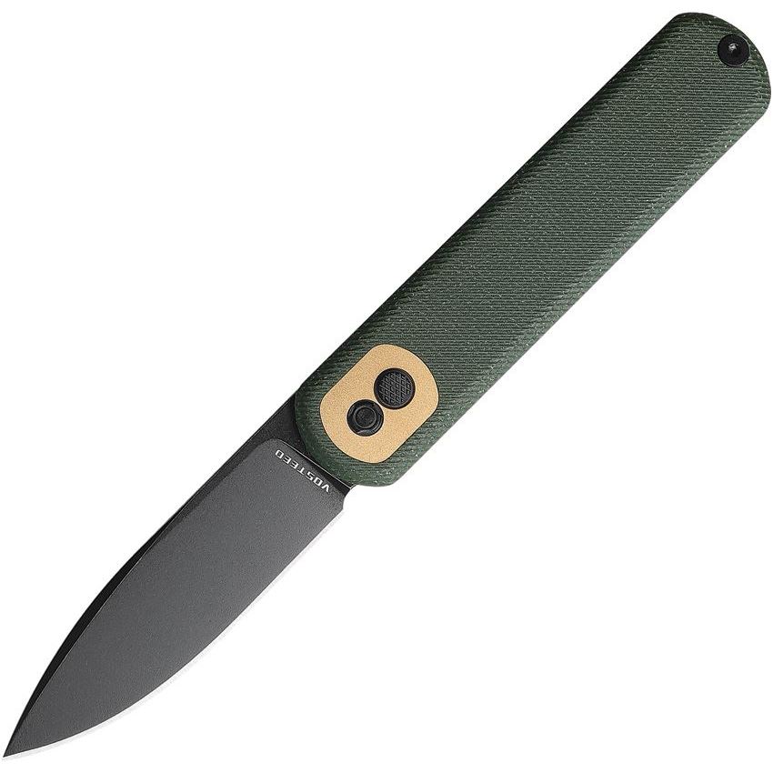 Model/Item/Part - VOSCGSVM1. Vosteed Corgi Treklock Micarta. 4.18" (10.62cm) closed. 2.99" (7.60cm) black stonewash finish 14C28N steel drop point blade. Green micarta handle. Pocket clip. Made in China.