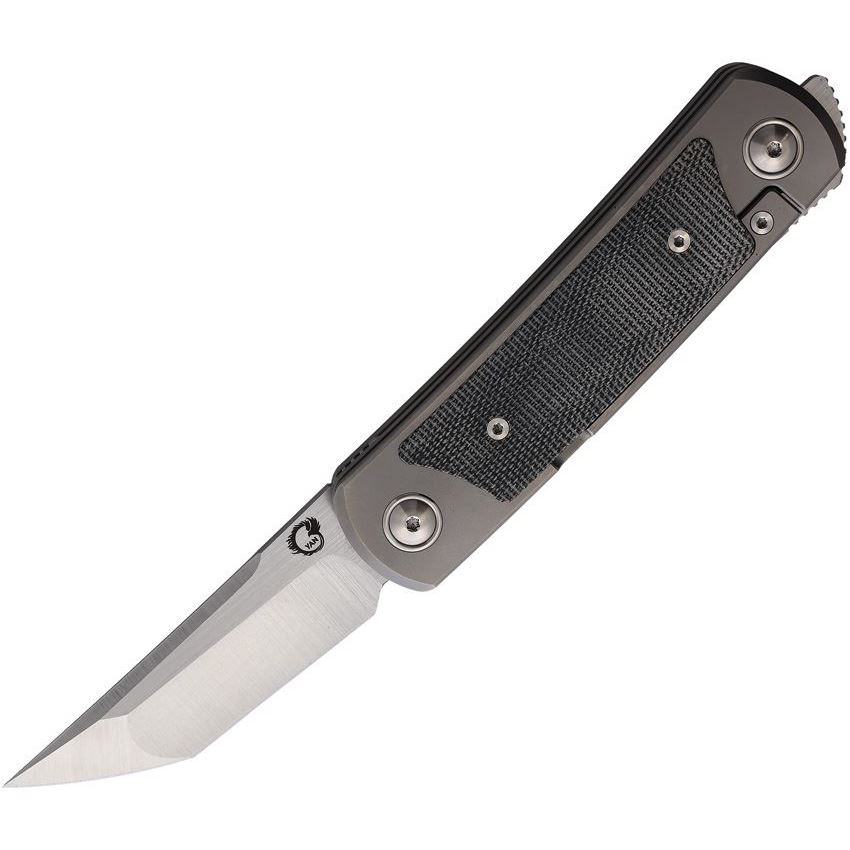 Model/Item/Part - YKEMWBM. Yan Knives - EMW Knife Micarta. 4.25" (10.8cm) closed. 3" (7.62cm) satin finish Bohler M390 stainless blade. Bead blast finish titanium handle with Twill carbon fiber inlay. Pocket clip. Extended tang. Tanto and drop point blades. Black leather belt sheath. Boxed. Made in China.