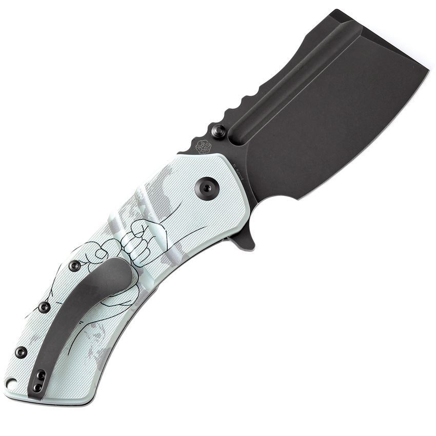 Model/Item/Part - KT1030B5. Kansept Knives - XL Korvid Knife Jade. 5.25" (13.34cm) closed. 3.5" (8.89cm) black stonewash finish 154CM stainless blade. Jade G10 handle. Extended tang. Lanyard hole. Pocket clip. Thumb stud. Parent and child hands print handle. Black nylon pouch. Boxed. Made in China.