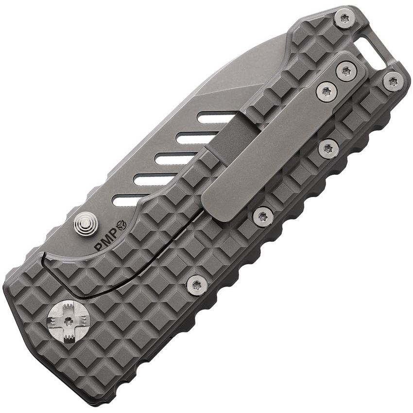 Model/Item/Part - PMP061. PMP Knives - Kodiak Knife Gray. 5" (12.7cm) closed. 4" (10.16cm) satin finish Bohler M390 stainless blade. Gray titanium handle. Pocket clip. Thumb stud. Lanyard hole. Silver accents. Water tight storage case. Made in China.