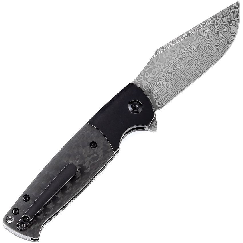 Model/Item/Part - K2027D1. Kansept Skikari SBL Button Lock. 4.38" (11.13cm) closed. 3.38" (8.59cm) Damascus steel clip point blade. Twill carbon fiber handle. Stainless bolster(s). Extended tang. Lanyard hole. Pocket clip. Black nylon pouch. Boxed. Made in China.