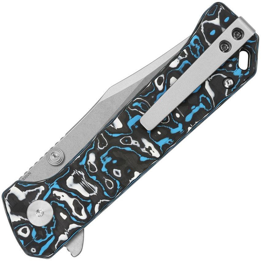 Model/Item/Part - QS147H1. QSP Grebe Button Lock BWB CF. 4.25" (10.8cm) closed. 3" (7.62cm) stonewash finish S35VN stainless clip point blade. Black, white, and blue carbon fiber handle. Extended tang. Lanyard hole. Pocket clip. Thumb stud. Boxed. Made in China.