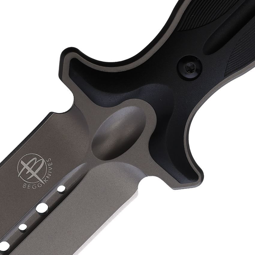 Model/Item/Part - BG028. Begg Knives - Filoso Dagger Gray. 11.75" (29.85cm) overall. 6" (15.24cm) gray titanium coated double edge 1095HC steel dagger blade. Black sculpted nylon handle. Full tang. Lanyard hole. Made in China.