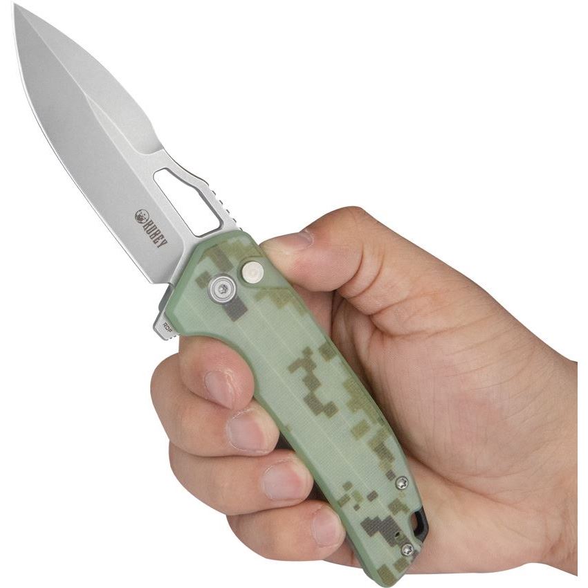 Model/Item/Part - KUB316C. Kubey Knives - RDF Button Lock Knife Camo Handles. 4.25" (10.8cm) closed. 3.13" (7.95cm) bead blast finish AUS-10A stainless blade. Digital camo G10 handle. Thumb pull. Extended tang. Lanyard hole. Pocket clip. Boxed. Made in China.