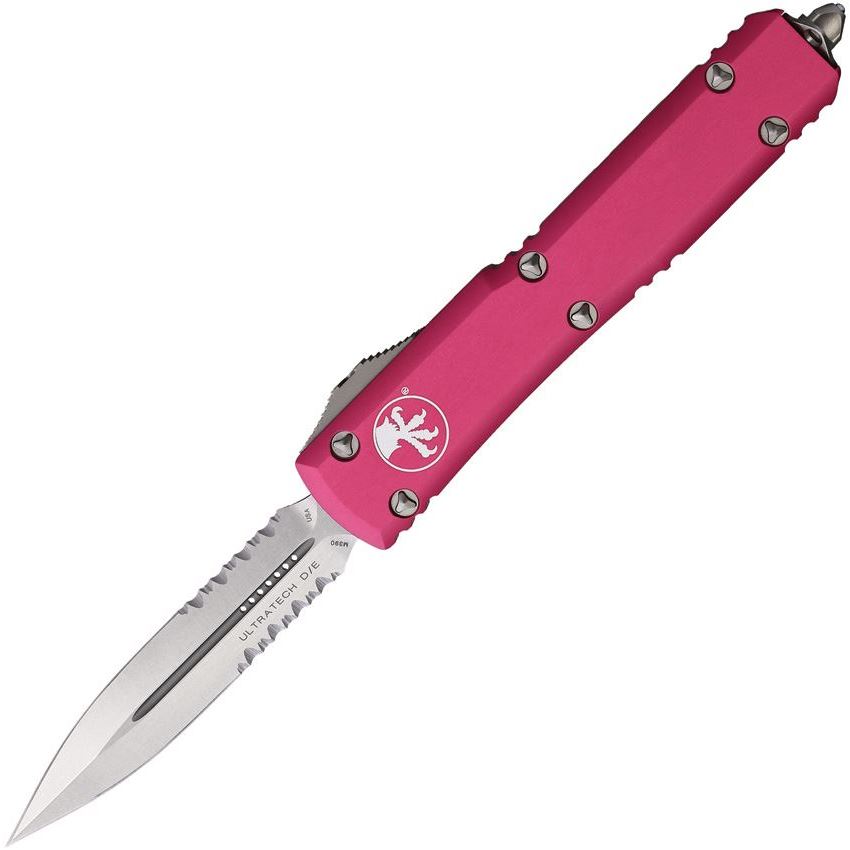 • Microtech 12211PK - Auto Ultratech Stonewashed Part Serrated Double Edge OTF Knife Pink Handles