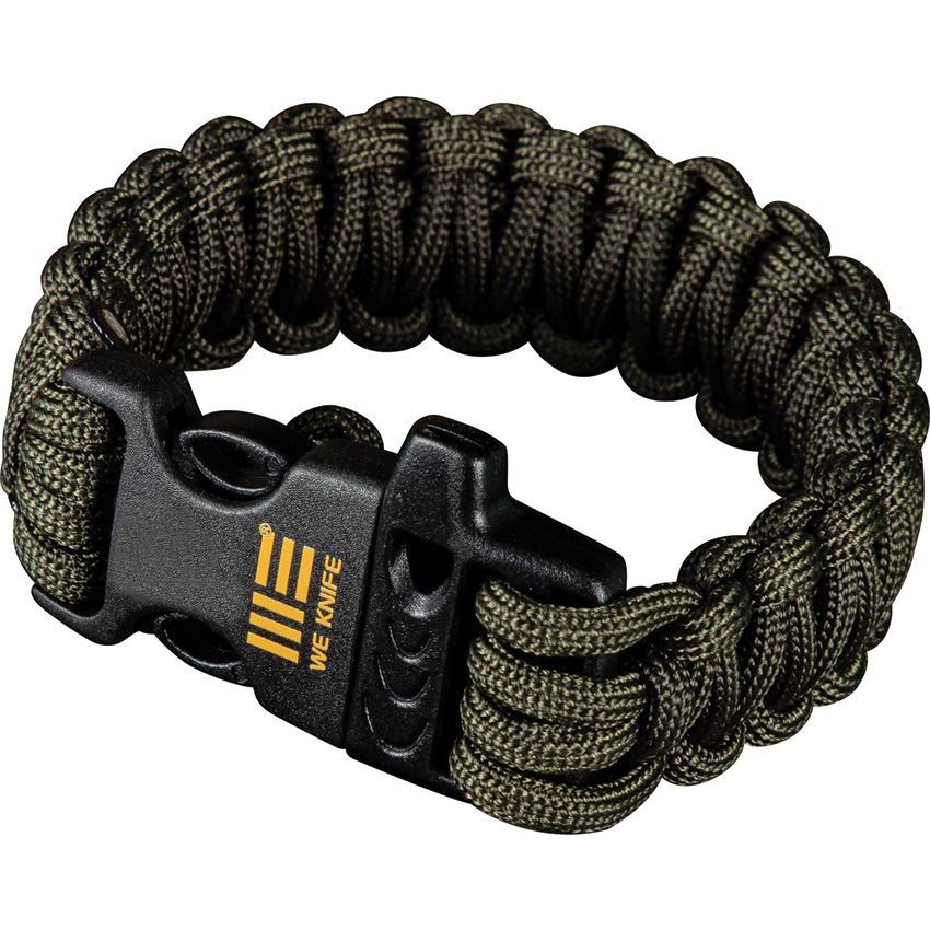 Model/Item/Part - WEPCB. WE Knife Company - Paracord Bracelet Green. Product Dimensions: 9.88" x 1.29". Color: OD green. Plastic clasp. 118.11ft. Hang packaged. Made in China.