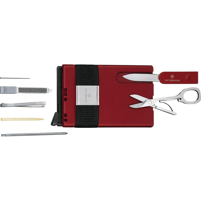 Model/Item/Part - VN0725013. Swiss Army Knives - Smart Card Wallet Iconic Red. Tools include: Toothpick l Tweezers l Pen l File l Screwdriver tip l Scissors I Pin I Emergency blade. Card protector and money band in a secure wallet. Slim, minimal design. Color: Iconic red. Boxed. Made in Switzerland.