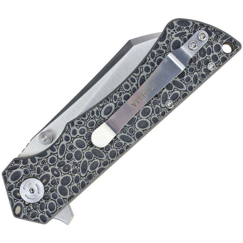 Model/Item/Part - STT301BL. S-TEC Knives - Proelia Linerlock Knife with Black G10 Handles. 4.75" (12.07cm) closed. 3.75" (9.53cm) satin finish 7Cr17MoV stainless blade. Black and gray textured G10 handle. Thumb stud. Lanyard hole. Extended tang. Pocket clip. Boxed. Made in China.