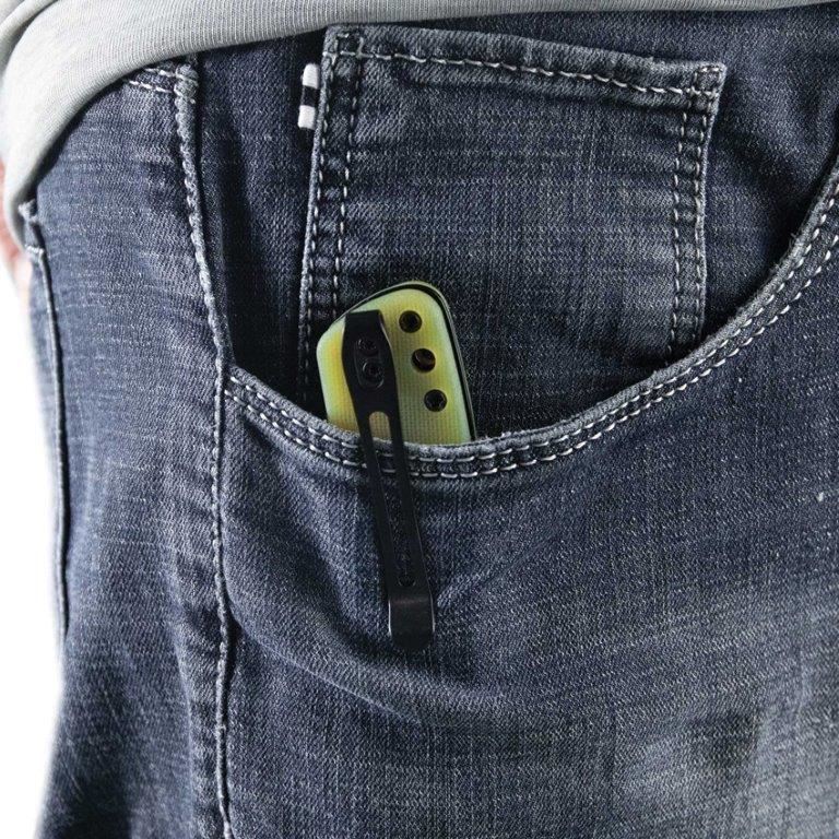 Model/Item/Part - KUB344F. Kubey Knives - Momentum Linerlock Knife with Yellow Handles. 4.5" (11.43cm) closed. 3.5" (8.89cm) black stonewash finish AUS-10A stainless blade. Yellow translucent G10 handle. Extended tang. Thumb stud. Lanyard hole. Pocket clip. Boxed. Made in China.