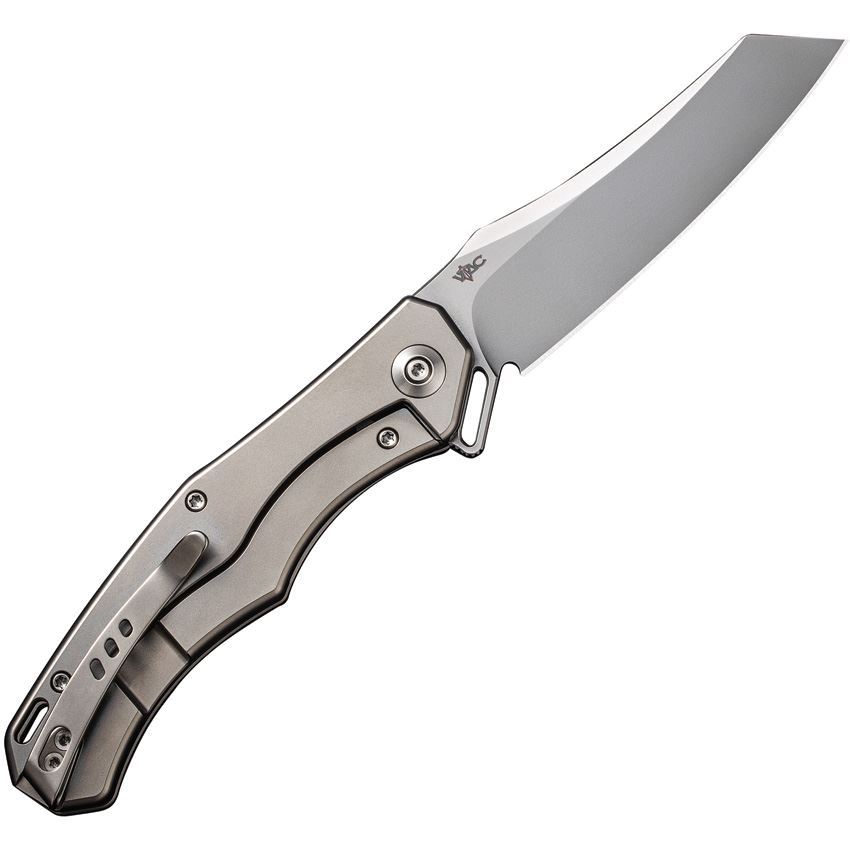 Model/Item/Part - WE22010G2. WE Knife Company - RekkeR Framelock Knife Gray Handles. 4.63" (11.76cm) closed. 3.63" (9.22cm) bead blast finish CPM-20CV stainless blade. Gray bead blast finish titanium handle. Extended tang. Lanyard hole. Pocket clip. Reverse tanto blade. Black nylon pouch. Boxed. Made in China.