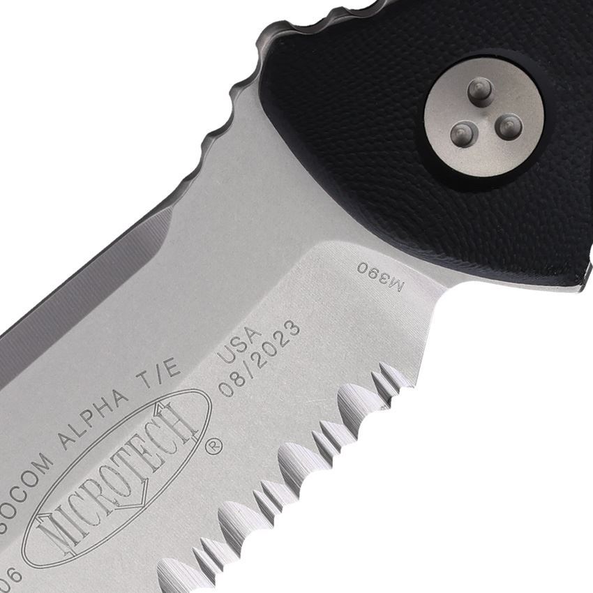 Model/Item/Part - MCT11412. Microtech Socom Alpha T/E F/S SW. 10.5" (26.67cm) overall. 5.38" (13.67cm) stonewash finish serrated premium steel tanto blade. Black G10 handle. Full, extended tang. Lanyard hole. Black Kydex belt sheath. Boxed. Made in USA.