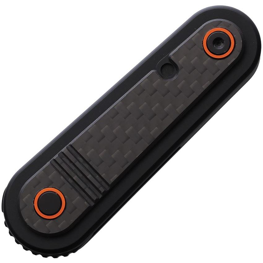 Model/Item/Part - REVSPRTBK. Revo Spirit Button Lock Black. 2.88" (7.32cm) closed. 1.88" (4.78cm) black stonewash finish 14C28N Sandvik stainless blade. Black stainless handle with carbon fiber onlay. Folding lanyard hole. Boxed. Made in China.