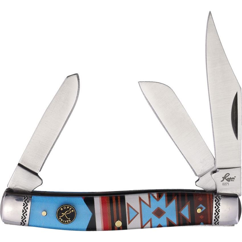 Model/Item/Part - RP0001WS2. Roper Stockman Sunset Series 2. 3.88" (9.86cm) closed. Satin finish carbon steel clip, sheepsfoot, and spey blades. Acrylic handle. Nickel silver bolster(s). Inlay shield. Southwest handle artwork. Boxed. Made in China.