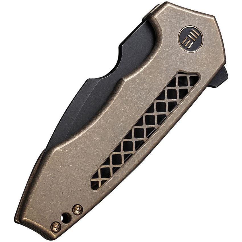 Model/Item/Part - WE230193. WE Harpen Framelock Bronze. 4" (10.16cm) closed. 3" (7.62cm) black stonewash finish CPM-20CV stainless modified drop point blade. Bronze stonewash finish titanium handle. Extended tang. Lanyard hole. Pocket clip. Black nylon zippered storage case. Boxed. Made in China.