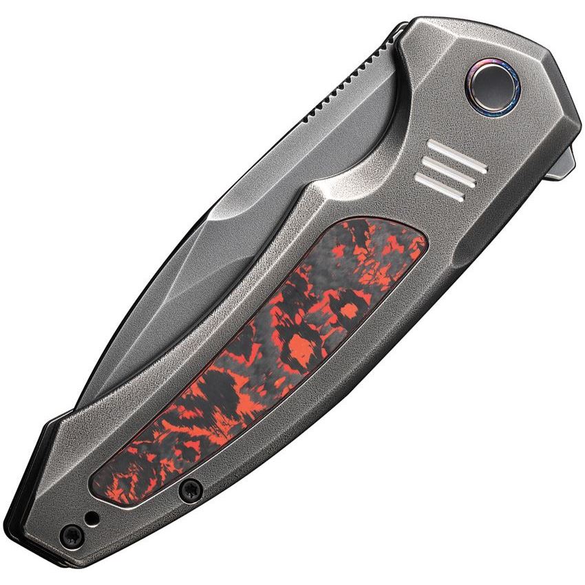Model/Item/Part - WE230302. WE Hyperactive Framelock Vanax. 4.88" (12.4cm) closed. 3.88" (9.86cm) gray finish blade. Orange peel titanium handle with Lava Flow Fat carbon fiber inlay. Extended tang. Pocket clip. Vanax blade. Black nylon zippered storage case. Boxed. Made in China.