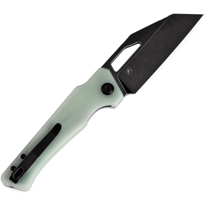 Model/Item/Part - KT1033A6. Kansept - Egress Linerlock Knife Jade G10 Handles. 4.75" (12.07cm) closed. 3.5" (8.89cm) black stonewash finish 14C28N Sandvik stainless Wharncliffe blade. Jade G10 handle. Extended tang. Pocket clip. Thumb pull. Black nylon pouch. Boxed. Made in China.