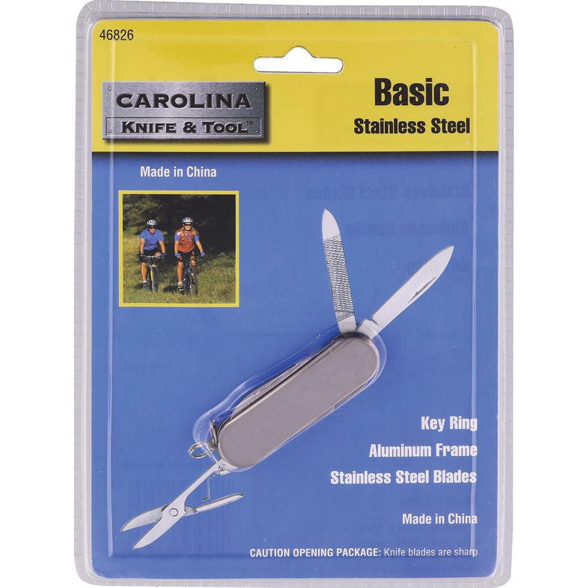 Model/Item/Part - CKT46826. Carolina - Basic Folding Knife. 2.25" (5.72cm) closed. Tools include: Keyring l File l Small blade l Scissors. Clam packed. Made in China.