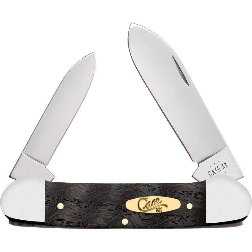 Model/Item/Part - CA14003. Case XX - Canoe Knife Knife Black Curly Oak Handles. 72131 SS pattern. 3.63" (9.22cm) closed. Mirror finish stainless spear and pen blades. Black Curly Oak handle. Nickel silver bolster(s). Inlay shield. Boxed. Made in USA.