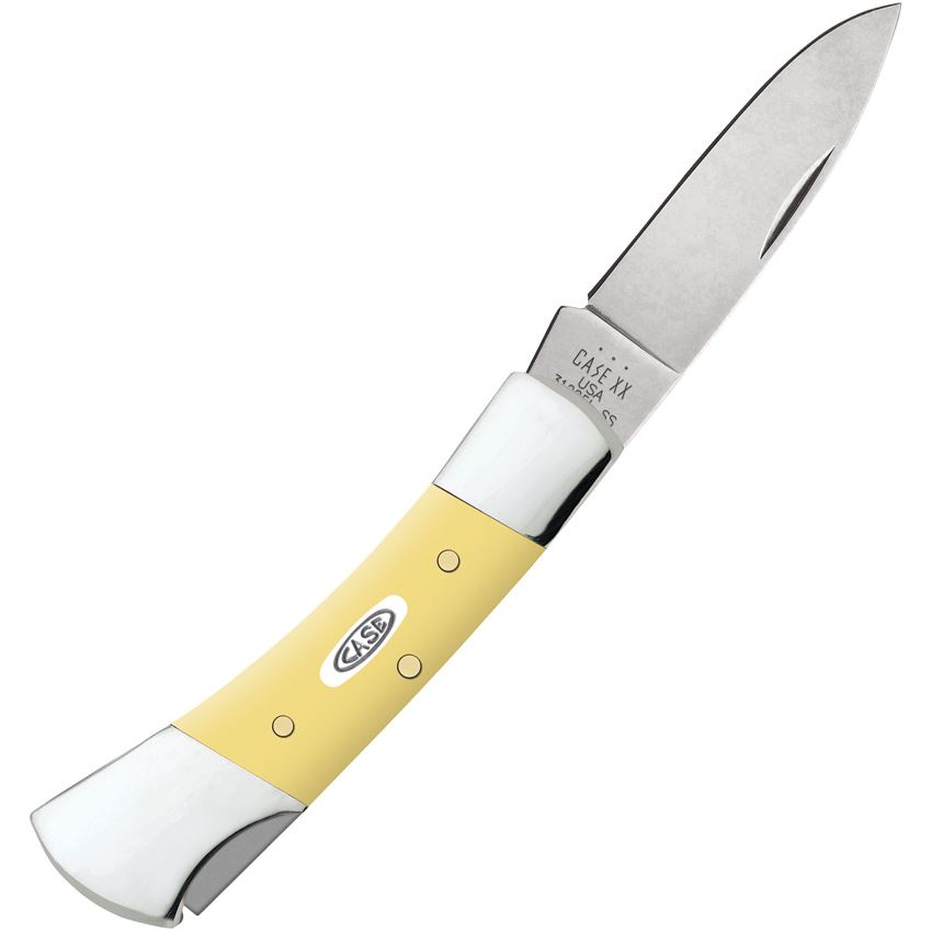 Model/Item/Part - CA81089. Case XX - Lockback Knife Yellow Synthetic Handles. 31225L SS pattern. 3" (7.62cm) closed. Stonewash finish stainless drop point blade. Yellow smooth synthetic handle. Nickel silver bolster(s). Inlay shield. Boxed. Made in USA.