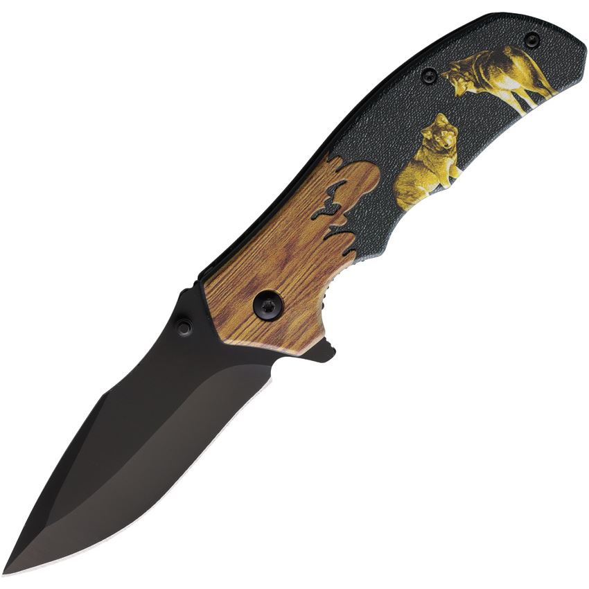 Model/Item/Part - EE10A47WF. ElitEdge - Wolf Assist Open Linerlock Knife Black Handles. Assisted opening. 4.75" (12.07cm) closed. 3.5" (8.89cm) black finish 420C stainless blade. ABS handle. Thumb stud. Extended tang. Pocket clip. Wolf handle artwork. Boxed. Made in China.