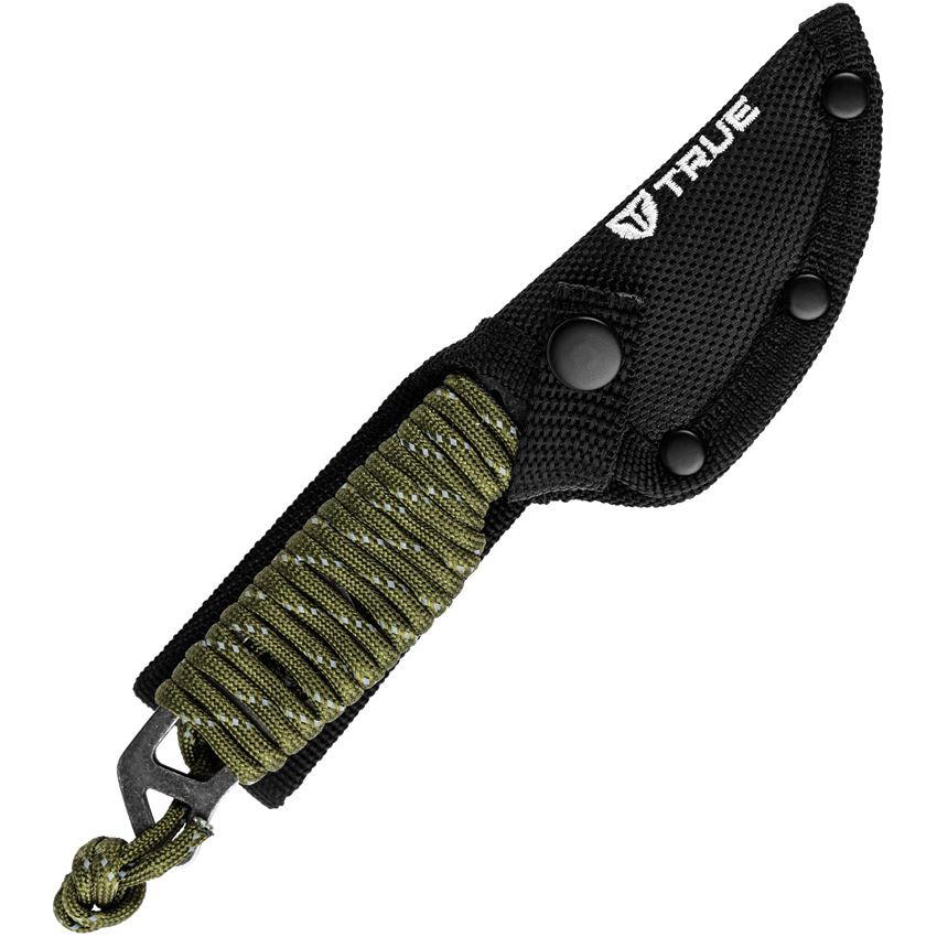 Model/Item/Part - TRUFXK1020. TRUE - NEKKID Black Stonewashed Fixed Blade Knife Green Wrapped Handles. 6.5" (16.51cm) overall. 2.5" (6.35cm) black stonewash finish stainless sheepsfoot blade. Green skeletonized cord wrapped handle. Full tang. Clam packed. Made in China.